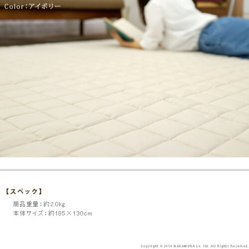 【カラーバリエーション】 ベージュ・アイボリー・グリーン 【仕様】 本体:綿100% 裏面:不織布(滑り止め加工) 中綿:ポリエステル100% 【サイズ】 約185x130cm 重量:約2kg 株式会社ナカムラ(33100049)